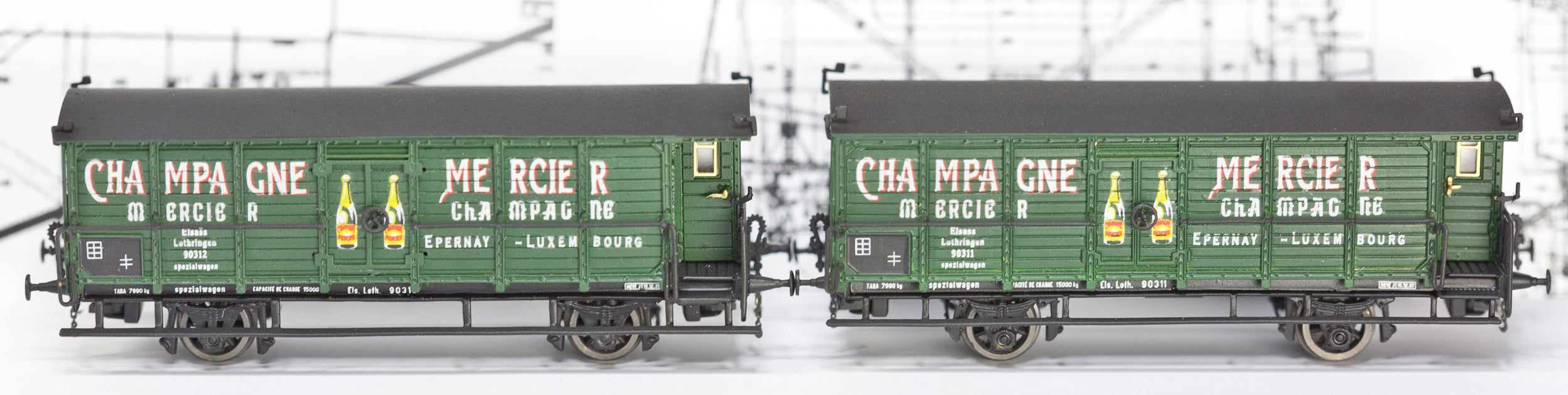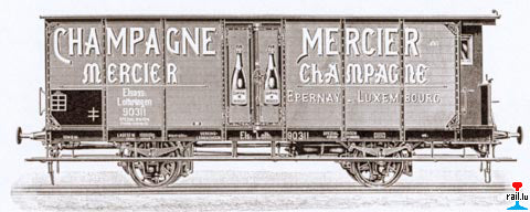 In 1905 company Champagne Mercier (Épernay region of Champagne) got two specialised wagons to carry their products. Wagons were registered in Épernay-Luxembourg, (Elsass-Lothringen) with board numbers 90311 and 90312, which later changed and became 600391 and 600392. Though the rest writing on the wagons remained the same.